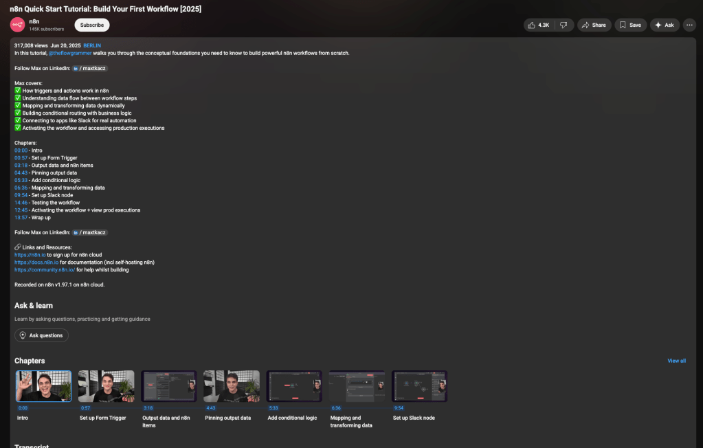 n8n drops you into a quick start video immediately, which I thought was a smart move. The tutorial walks through building a form trigger that sends a Slack notification, covering the fundamentals: triggers, actions, data mapping, and conditional logic.