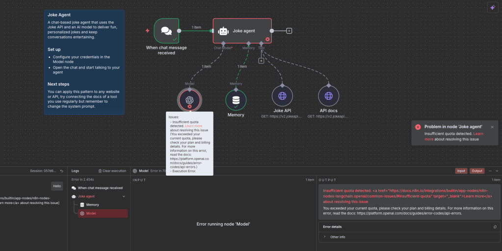 The moment I tried to test the agent, the moment I typed a single word… it broke. The error message was cryptic: “Insufficient quota detected.” I assumed I’d done something wrong. The n8n interface gave no hint about what “quota” meant or how to fix it.